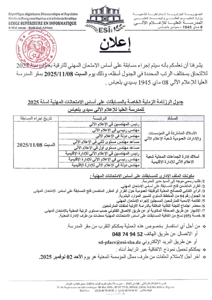 Ecole Superieure en Informatique 08-MAI-1945 SIDI BEL ABBES > Actualités > إعلان عن تنظيم دورة للمسابقات والامتحانات المهنية بعنوان سنة 2025