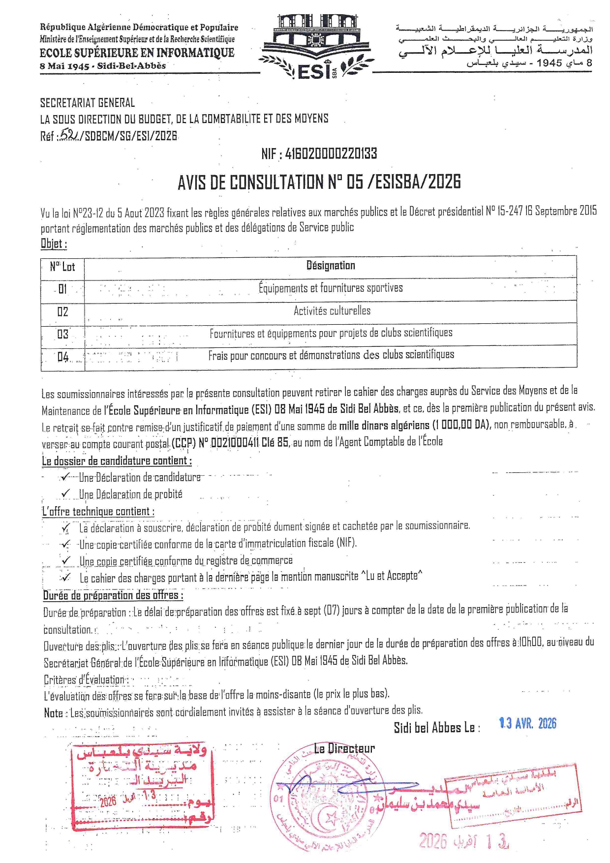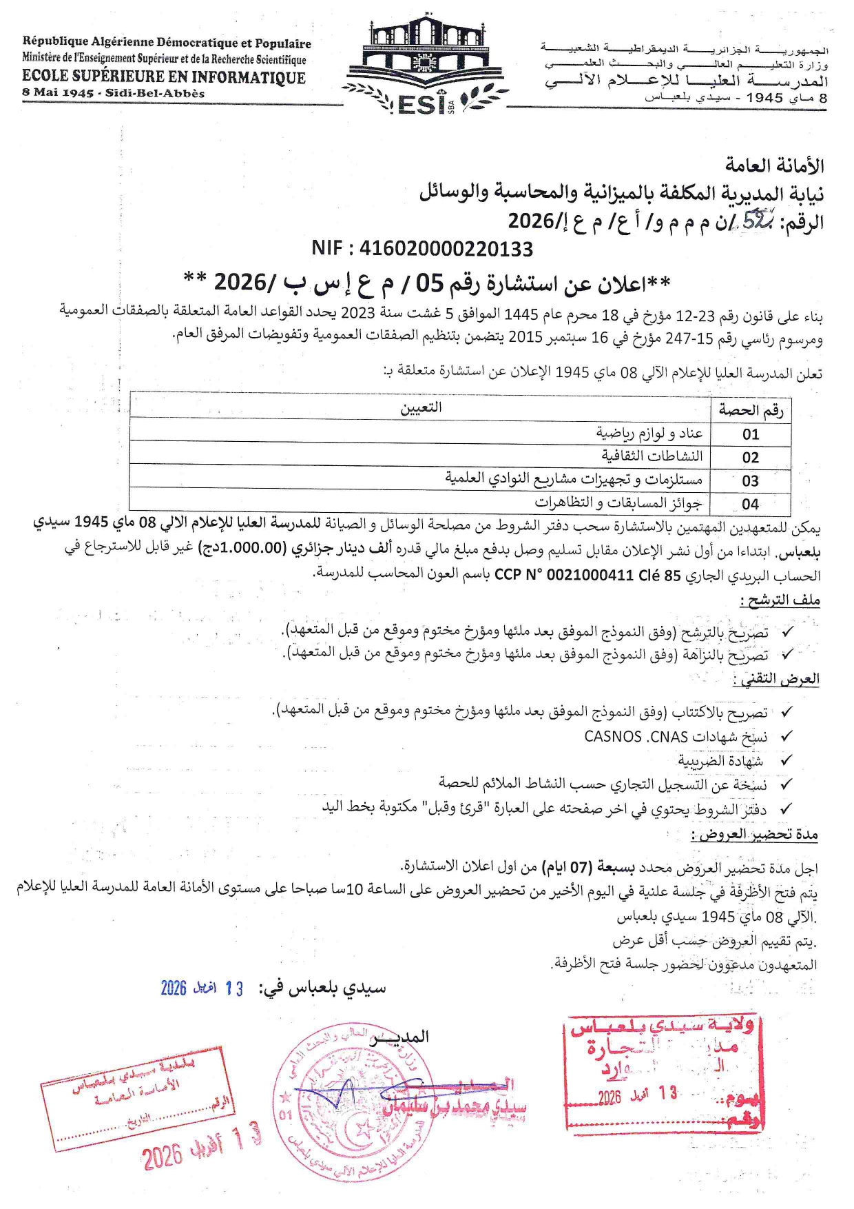 Ecole Superieure en Informatique 08-MAI-1945 SIDI BEL ABBES > Blog > استشارة رقم 05 /2026