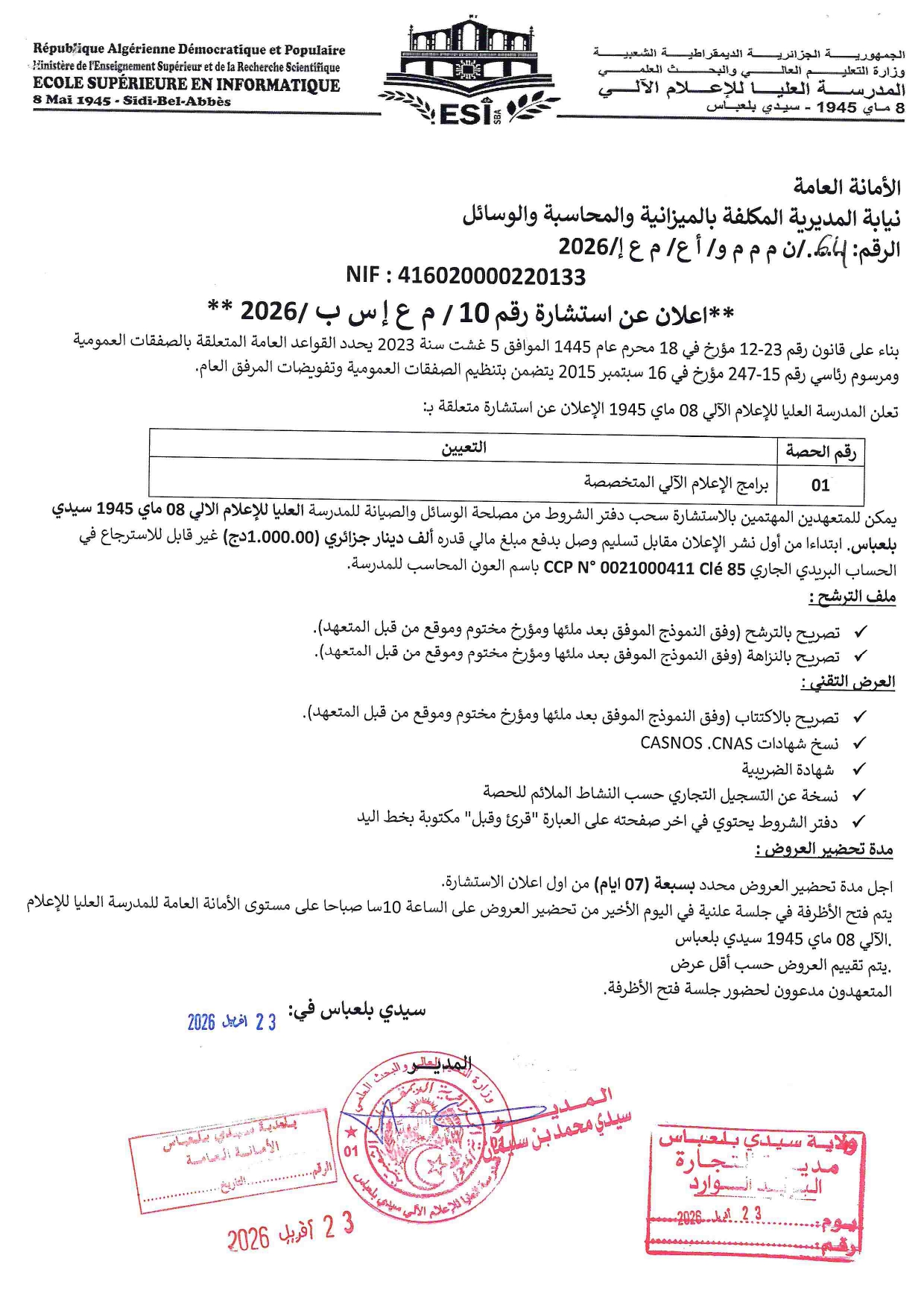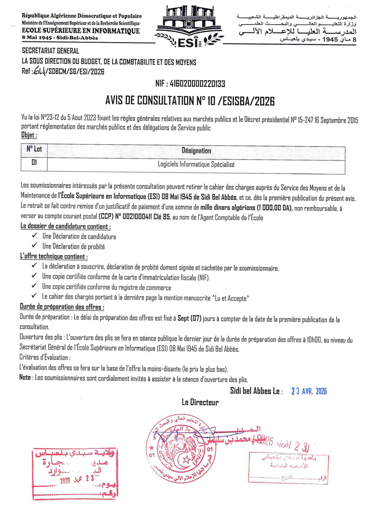 Ecole Superieure en Informatique 08-MAI-1945 SIDI BEL ABBES