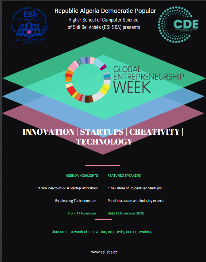 The Higher School of Computer Science of Sidi Bel Abbès (ESI-SBA) hosted the first day of Entrepreneurship Week yesterday, as part of ongoing efforts to promote a spirit of initiative and strengthen an entrepreneurial mindset among students.