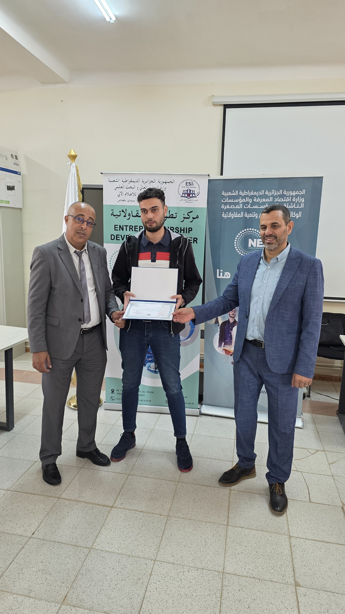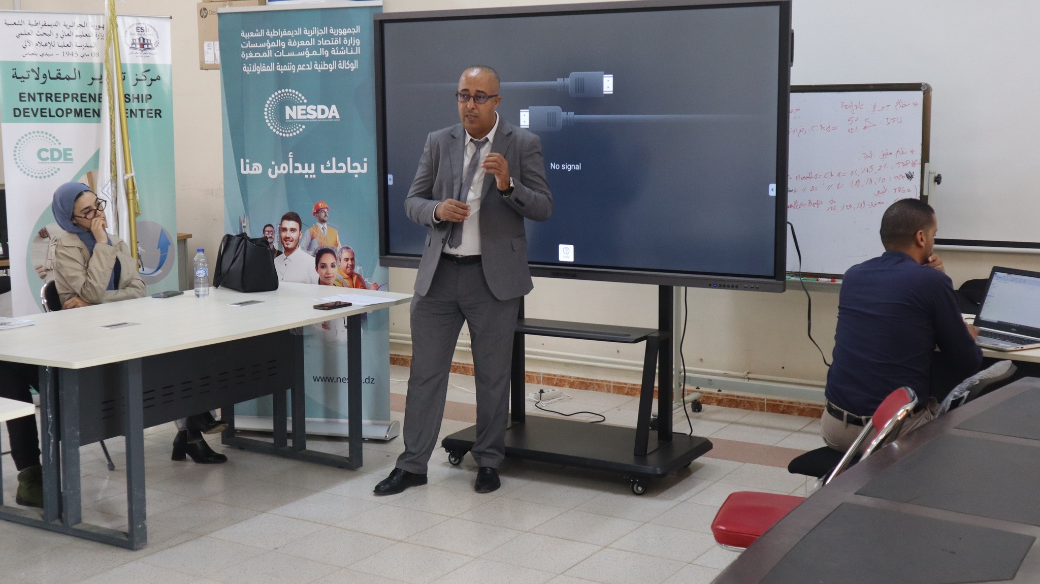 Mr. Mahla Houari, Director of the National Agency for Entrepreneurship Support and Development (NESDA الوكالة الوطنية لدعم و تنمية المقاولاتية), also delivered a speech emphasizing the agency’s role in guiding young people and helping them transform their entrepreneurial ideas into successful economic ventures. He further stressed the importance of collaboration between academic institutions and support organizations.